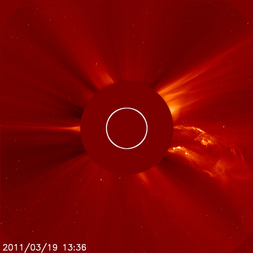 Am Samstag den 19.03.2011 gab es um ca. 12:36 UT (ca. 13.36 Uhr MEZ) eine heftige Sonneneruption, die jedoch nicht zur Erde gerichtet war. [siehe Foto links] gefolgtr von einer kleineren gegen 17.30 UT. Auswirkungen auf der Erde sind dadurch nicht zu erwarten.